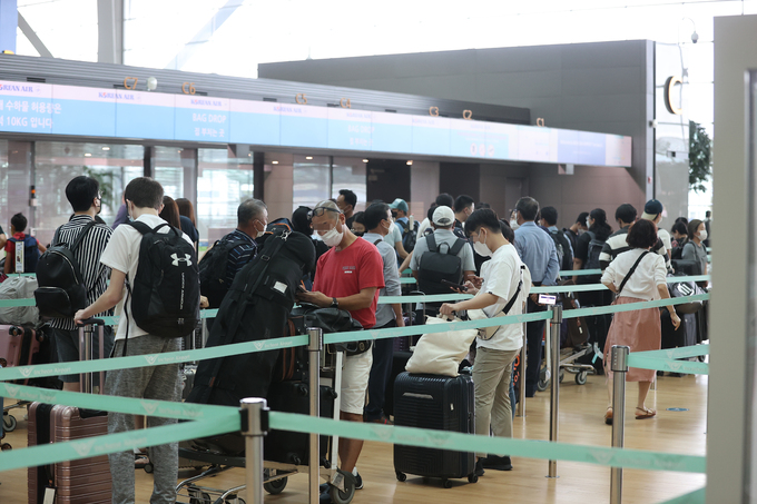 지난 17일 인천국제공항 제2여객터미널의 한 대형항공사 체크인 카운터가 탑승객들로 붐비고 있는 모습. 연합뉴스