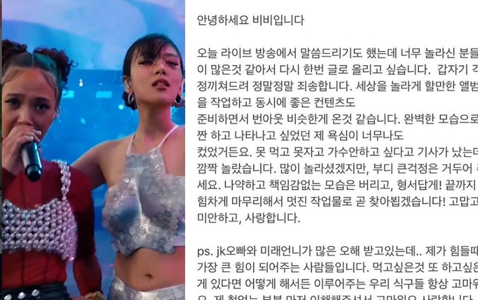 이후 23일 비비는 인스타그램을 통해 “놀라신 분들이 있어 다시 글을 올린다. 준비하면서 번아웃 비슷한 게 온 것 같다. 완벽한 모습으로 짠 하고 나타나고 싶었던 제 욕심이 너무나도 컸다”며 해명했다.