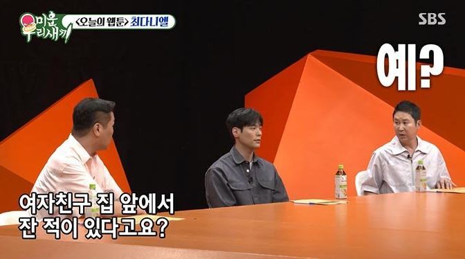 이에 신동엽이 “여자친구 집이 아니라 집 앞에서 잔 거냐”며 깜짝 놀라 되묻자 최다니엘은 “그때가 대학생 때였다. 내가 대학교 ‘CC(캠퍼스 커플)’였는데 원래 그때는 자주 싸우지 않나. 그날도 싸우고 여자친구 집에 찾아갔는데 아예 나오지도 않더라. 연락이 아예 안 되더라”고 회상했다.