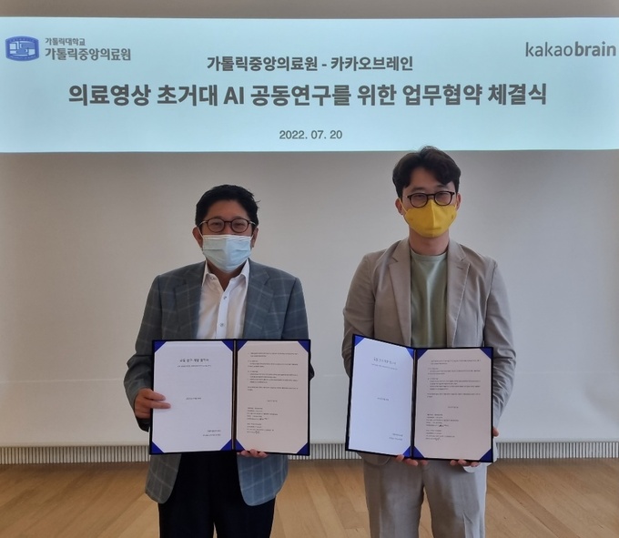 카카오브레인이 가톨릭대학교 가톨릭중앙의료원과 의료영상 분야의 초거대 AI 모델 연구를 위한 업무협약(MOU)을 체결했다고 25일 밝혔다.