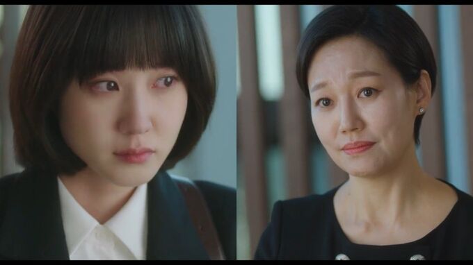 ‘이상한 변호사 우영우’ 8화 중 주인공 우영우(왼쪽사진·박은빈 분)가 자신을 버린 생모 태수미(진경 분)를 만나 대화하는 장면.  ENA 제공