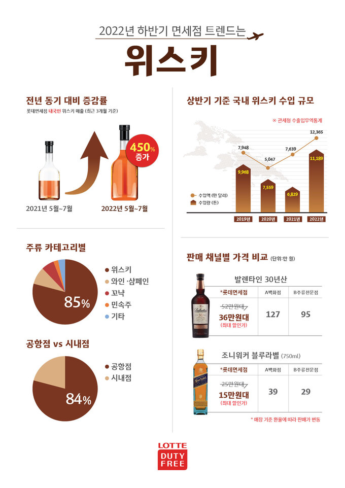 롯데면세점에 따르면 롯데면세점 내국인 주류 매출에서 위스키가 차지하는 비중은 전체의 85%로, 와인‧샴페인(6.3%), 코냑(3.8%), 민속주(1.9%) 등 다른 주종을 크게 앞서는 것으로 나타났다.