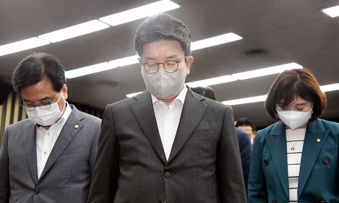권성동 국민의힘 원내대표를 비롯한 의원들이 지난 1일 서울 여의도 국회에서 열린 의원총회에서 묵념하고 있다.