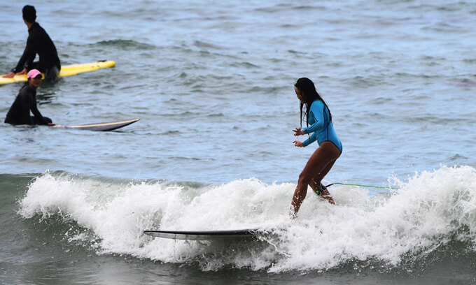 태풍 ‘송다’와 ‘트라세’의 영향으로 높은 파도가 일고 있는 경남 남해군 송정솔바람해변에서 일부 피서객들이 2일 서핑을 즐기고 있다.