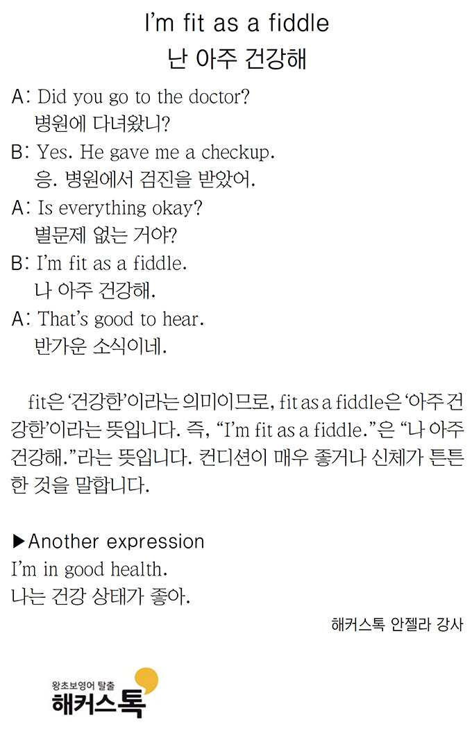 [해커스톡 일대일 영어회화] 하루 1분 기초 영어회화 말하기 (8월 4일) 입력 : 2022-08-04 09:00:00 수정 : 2022-08-03 18:48:54 구글 네이버 유튜브 I’m fit as a fiddle 난 아주 건강해 Copyright ⓒ 세계일보. 무단 전재 및 재배포 금지 세계일보