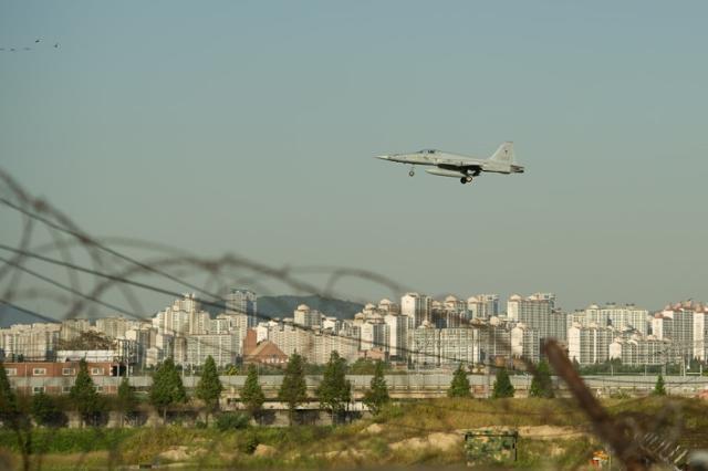 공군 전투기가 수원 군공항 상공에서 아파트 단지를 배경으로 착륙하고 있다. 수원시 제공