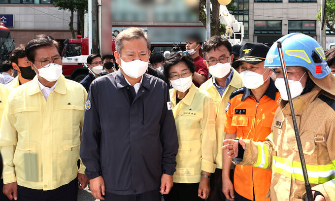 이상민 행정안전부 장관은 5일 경기 이천시 관고동 병원 건물 화재 현장을 찾아 철저한 원인 조사와 함께 사상자·유가족 지원에 만전 기할 것을 지시했다.