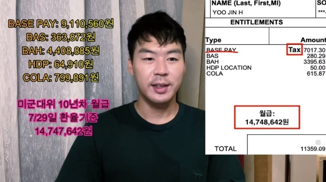 그는 미군 10년 차에 기본 월급이 ‘911만 560원’선이라고 전했다.