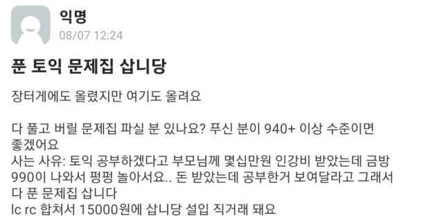 더불어 “LC와 RC 문제집 두 권을 합쳐서 총 1만5000원에 구매하고 싶다”며 “‘설입’(서울대 입구)에서 직거래가 가능하다”고 알렸다.