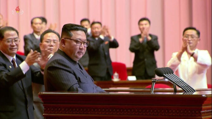 김정은 북한 국무위원장이 10일 평양에서 열린 전국비상방역총화회의를 주재하며 코로나19 사태 종식을 선언하자 참석자들이 박수를 치고 있다. 평양=조선중앙TV·뉴시스