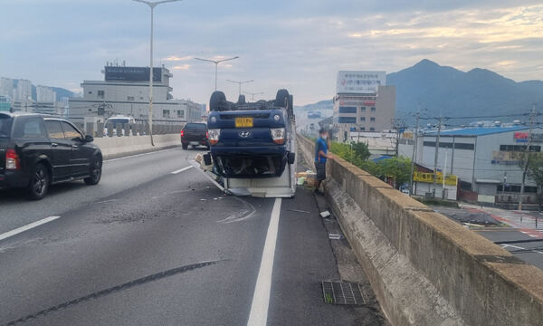 23일 부산경찰청 교통순찰대에 따르면 이날 오전 6시55분쯤 부산 사상구 동서고가로 시내방향 감전램프 부근에서 50대 A씨가 몰던 1t 트럭이 전복됐다.