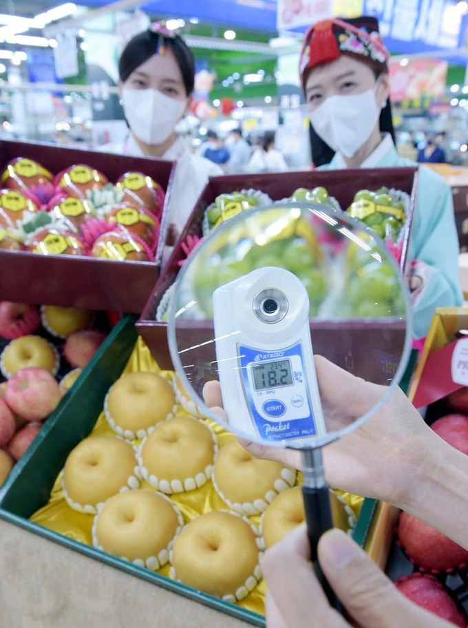 농식품 전문매장 농협 하나로마트를 운영하고 있는 농협유통(대표이사 신영호)은 임인년 추석 명절을 맞이하여 과일 선물세트의 당도를 직접 측정하며 과일 선물세트 품질 관리에 만전을 기하고 있다
