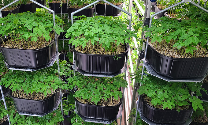 지난달 26일 스마트 농업기술 전문 전시회(Green & Agritech Asia)가 열린 광주 서구 김대중컨벤션센터 전시장, 29㎡(9평) 크기의 컨테이너 앞에 관람객들이 줄을 서 있었다. 코리아팜이 운영하는 ‘트롤리 컨베이어를 이용한 무빙 스마트팜’이다. 컨테이너에 들어가 보니 트롤리 컨베이어(trolley conveyor)가 원을 그리며 서서히 돌아가고 있었다. 트롤리 컨베이어의 레일에는 기다랗게 101개의 행거가 매달려 있다. 행거마다 쟁반 모양의 둥근 트레이(606개)가 수직으로 6단까지 연결돼 있다. 트레이에는 손바닥만 한 크기의 새싹 인삼이 파릇파릇하게 자라고 있다. 컨테이너 가장자리에 설치된 분무기에서는 물과 식물영양제가 자동으로 트레이에 분사됐다. 스마트폰으로 컨테이너 새싹 인삼의 생육상태를 점검하고 온도와 습도, 햇볕 등 환경을 자동으로 조절하는 시스템도 갖춰져 있다.