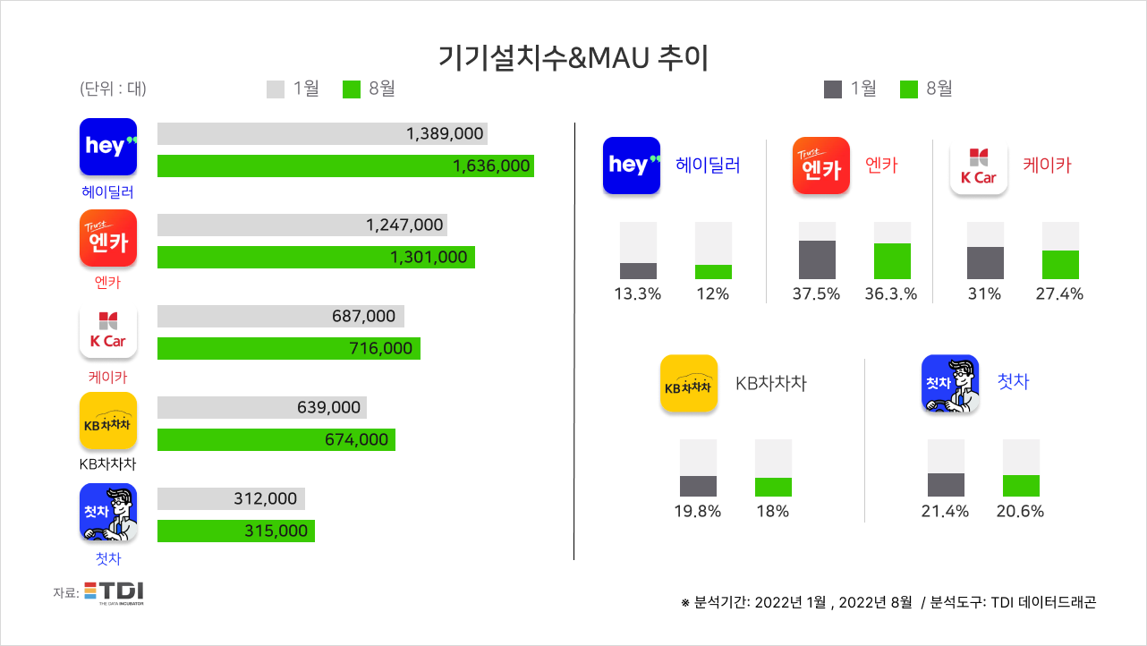 빅데이터 전문기업 TDI(티디아이, 대표 이승주)의 분석 플랫폼 데이터드래곤을 통해 ▲엔카 ▲케이카 ▲KB차차차 ▲첫차 ▲헤이딜러 등 중고차 앱을 분석한 결과 올해(1~8월) 기기설치수는 전체적으로 지속 증가한 것으로 나타났다. 가장 많이 증가한 앱은 헤이딜러었다. 1~7월은 매월 말일, 8월 자료는 25일 기준이다.