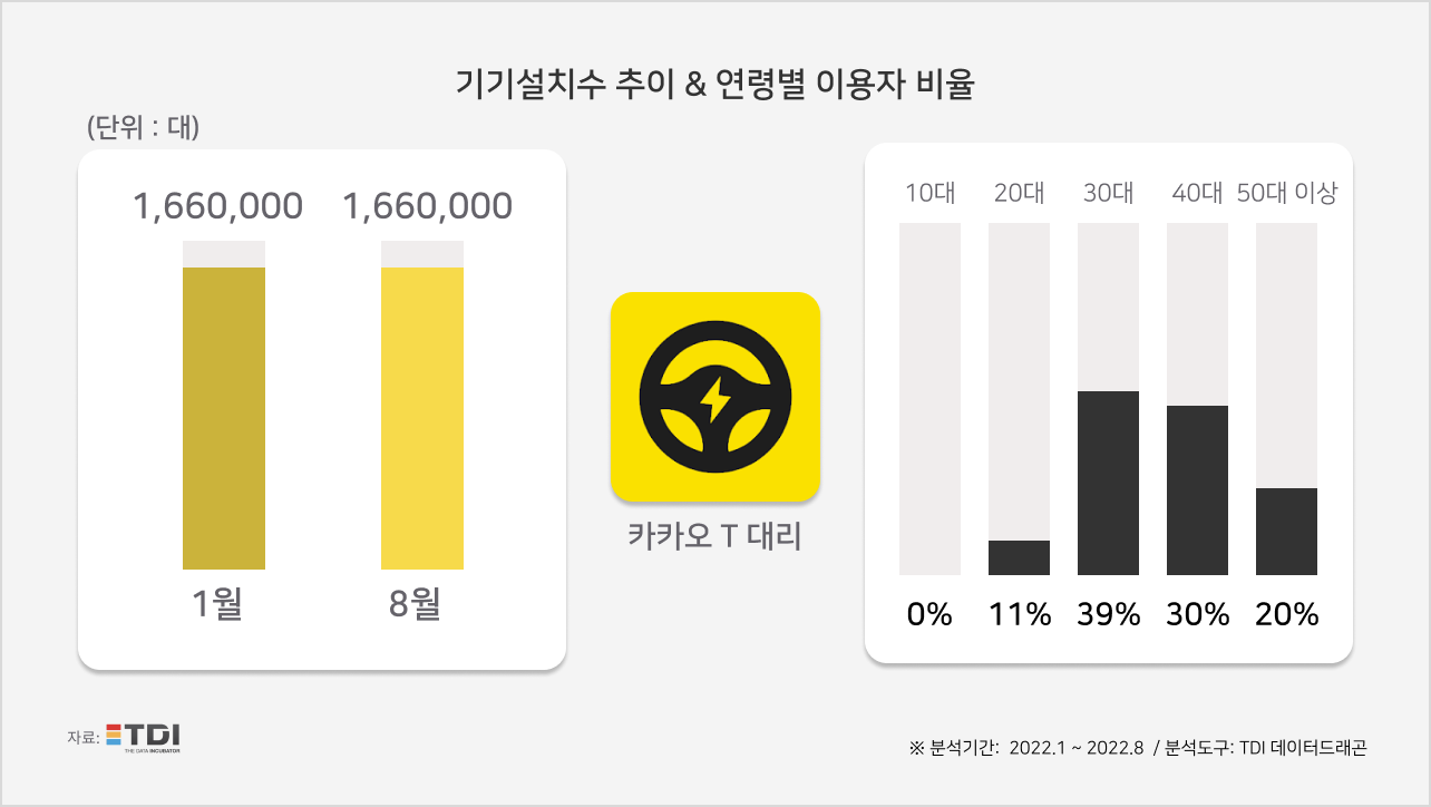 빅데이터 전문기업 TDI(티디아이)의 분석 플랫폼인 데이터드래곤을 통해 올해(1~8월) 카카오 T 대리 이용 현황을 분석해봤다.