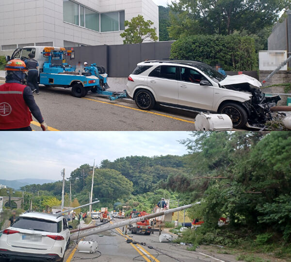 이날 사고는 20대 A씨가 SUV를 몰고 내리막길을 과속으로 달리다 과속 방지턱을 넘으면서 도로 왼쪽에 있던 전봇대를 들이받았다. 이 때 충격으로 전선에 연결된 다른 전봇대 1개도 같이 넘어졌다. 운전자 A씨도 가벼운 부상을 입었으나, 음주 운전은 아닌 것으로 파악됐다.