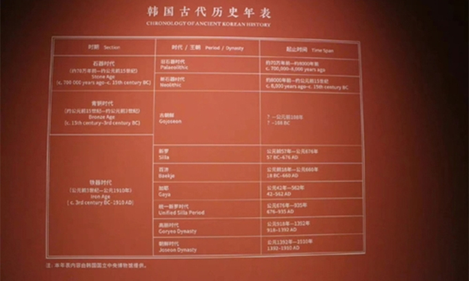 고조선부터 조선까지 각국의 건립 연도를 비교적 자세히 표기한 점 등으로 미뤄 고구려와 발해를 고의로 뺀 것으로 추정된다. 중국은 그러면서도 연대기표 하단에 관련 내용을 한국 국립중앙박물관이 제공했다는 표기를 덧붙였다.