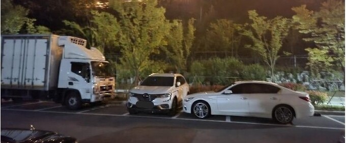 공개한 사진에는 흰색 탑차와 승용차가 논란이 일었던 벤츠와 같은 방식으로 가로 주차한 모습이 담겼다.