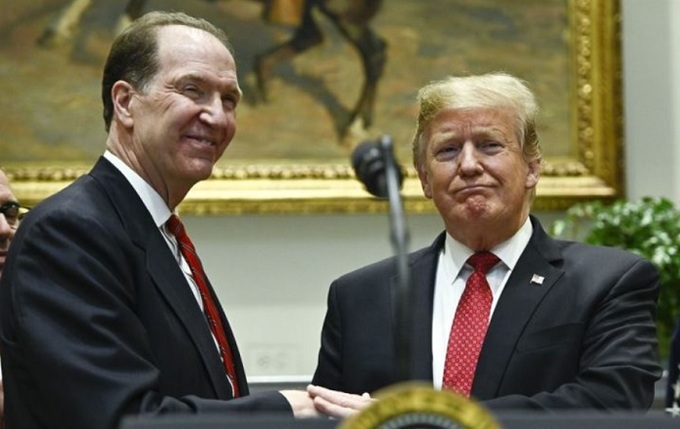 2019년 2월 세계은행 총재 후보자로 지명된 데이비드 맬패스(왼쪽) 당시 재무부 차관이 백악관에서 도널드 트럼프 대통령과 손을 맞잡은 채 환하게 웃고 있다. 워싱턴=UPI연합뉴스