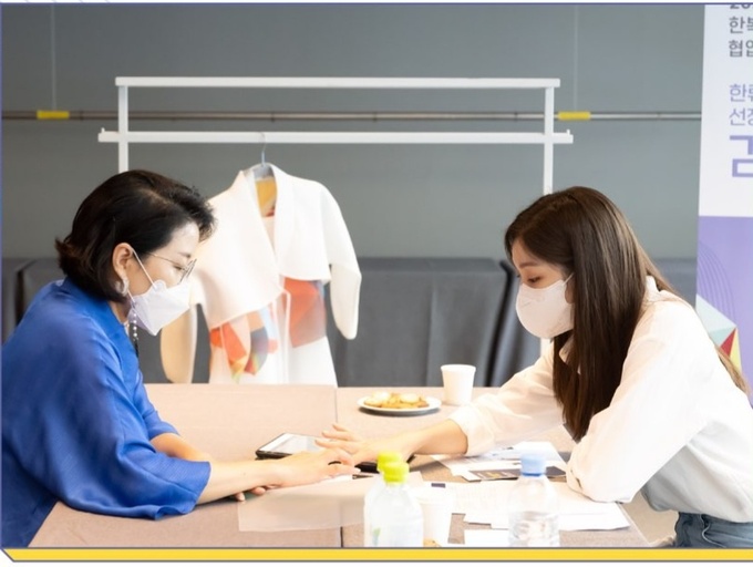 ‘2022 한복 분야 한류협업 기획·개발’ 사업에 참여한 김연아(오른쪽)가 지난달 8일 한복 디자이너와 함께 자신을 모티브로 한 한복 디자인과 관련해 협의하고 있다. 한국공예·디자인문화진흥원 인스타그램 캡처