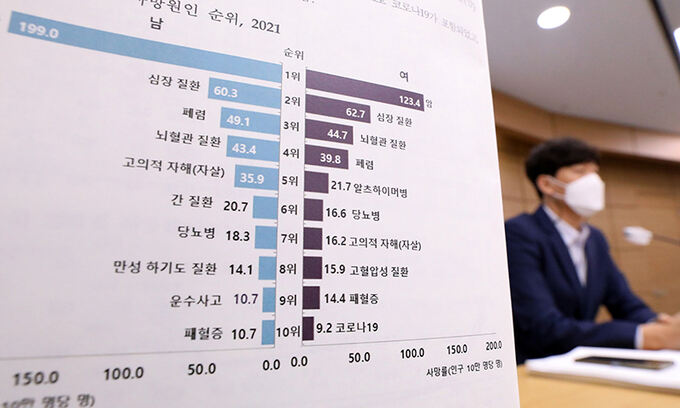 통계청은 이런 내용의 ‘2021년 사망원인 통계결과’를 27일 발표했다. 통계청에 따르면 지난해 상위 3대 사망원인은 암(8만2688명), 심장 질환(3만1569명), 폐렴(2만2812명)으로 나타났다. 지난해 사망자가 31만7680명인 점을 감안하면 전체의 약 26%가 암으로 사망한 셈이다.