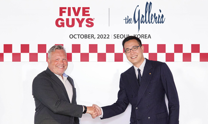 갤러리아는 6일 수제 버거 브랜드 파이브가이즈를 운영하는 파이브가이즈 인터내셔널과 국내 사업권 계약 약정서를 체결했다고 밝혔다. 파이브가이즈 국내 1호점은 내년 상반기 문을 연다.