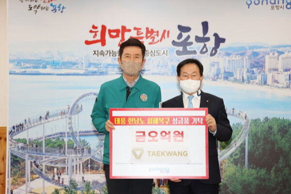 우선 태광그룹은 이날 오전 포항시청을 찾아 태풍 피해 복구를 위한 성금 5억 원을 기탁했다. 추석 명절 직전 태풍 ‘힌남노’로 주택 파손과 도로·교량 손실, 농작물 피해, 공장 침수로 인한 조업 중단 등 포항지역에 막대한 피해가 발생함에 따라 신속한 복구를 지원하기 위해 전달한 것이다.