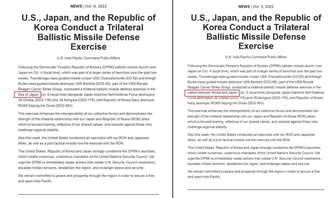 이후 인태사는 배포 자료에서 표기된 ‘일본해’를 몇 시간 뒤인 이날 새벽에 ‘한·일 사이 수역(waters between Korea and Japan)’으로 바꿨다. 그러나 미국 국방부 웹사이트 등에 배포된 사진 자료에는 여전히 ‘일본해’로 표기돼 있다.