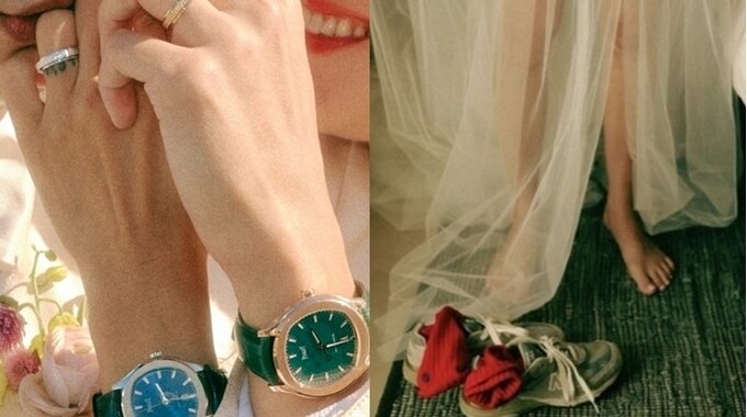 공개된 사진에는 공효진과 케빈오가 손을 맞잡고 환하게 웃고 있는 모습이 담겼다. 이때 두 사람의 손에 착용된 웨딩반지와 손목의 커플 시계가 이목을 집중시켰다.