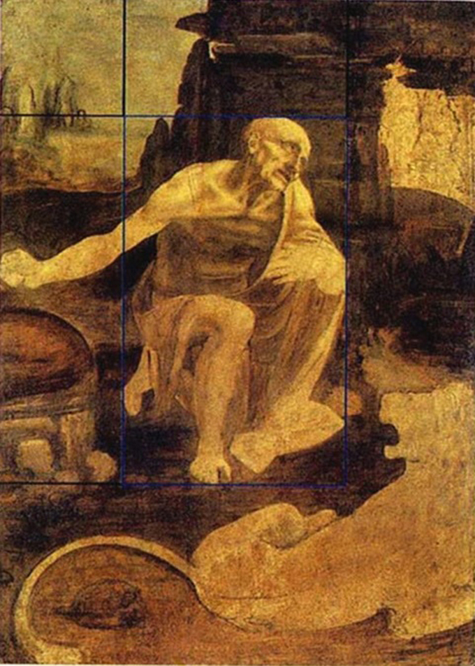 그림 방식에선 치밀한 계산이 엿보인다. 다빈치는 팔과 목, 어깨 등의 근육과 뼈의 구조를 해부학 지식을 바탕으로 그렸다. 앉아 있는 히에로니무스의 폭과 높이도 대략 4대 6 황금분할 비례의 틀 안에 맞췄다. 명암 대비를 통해 이 순간의 극적인 느낌도 놓치지 않았다. 키아로스쿠로라 불리는 명암대조법이 사람, 동물, 배경을 포함한 화면 전체를 뒤덮고 있다. 이런 계산된 형식이 좀 답답해 보일 수도 있지만 그림 한 장을 그리는 데에도 원칙이 있어야 한다는 다빈치의 노력이 서양미술사 최고의 전성기를 만들었다.