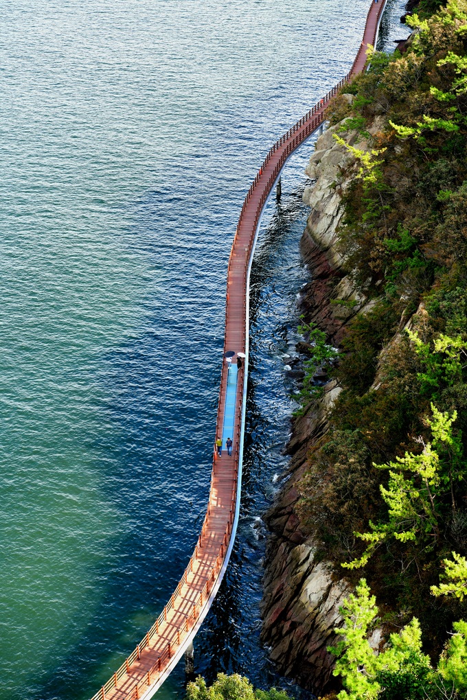 울창한 숲 사이로 난 오솔길을 500m쯤 걸으면 판옥선 13척을 쌓아올린 듯한 독특한 디자인으로 만든 고하도 전망대가 등장한다. 명량해전에서 13척으로 일본 함대 133척을 격파한 이순신 장군은 고하도에 통제영을 설치하고 106일 동안 머물며 전열을 가다듬었다. 군선 40척을 건조해 모두 53척으로 늘렸고 1000명에 불과하던 병사도 8000명으로 늘었다. 이를 바탕으로 이순신 장군은 마지막 전투인 노량해전에서 승리할 수 있었다. 고하도 전망대에 오르자 서쪽으로 고하도 용머리와 목포대교가 그림처럼 펼쳐진다. 반대쪽으로는 유달산과 해상케이블카가 목포 바다를 꾸미고 있다. 해안 절벽을 따라 놓인 데크길은 보기만 해도 아찔하다.