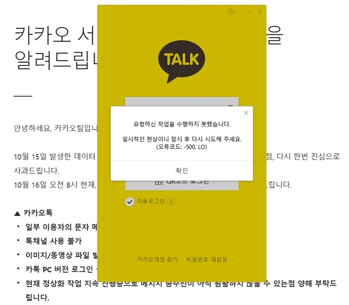 이어 “이미지·동영상 파일 발송이 불가하고 카카오톡 PC 버전의 로그인이 불가하다”며 “정상화 작업 진행 중으로 메시지 송수신이 원활하지 않을 수 있는 점 양해 부탁한다”고 전했다.