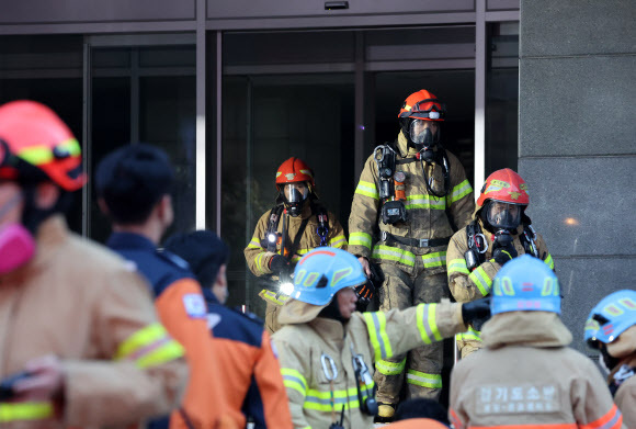 지난 15일 오후 화재가 발생한 경기 성남시 분당구 삼평동 SK 판교 캠퍼스 A동에서 소방관들이 분주하게 움직이고 있다. 성남=연합뉴스