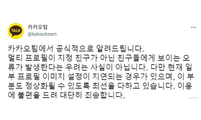 카카오 관계자는 "장애 사태로 멀티프로필을 업데이트할 때 속도가 지연되면서, 멀티프로필을 바꿨는데도 이전 것이 표시되는 경우가 있었다"면서 "이런 경우라도 기존에 설정한 그룹 외의 불특정 다수에게 노출이 된 것은 아니다"고 밝혔다.