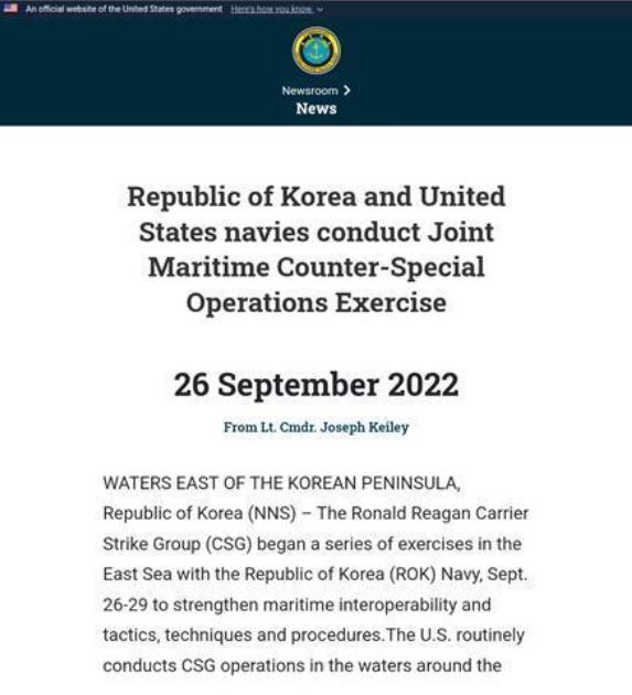 미국 태평양 함대는 한국·미국 해군과 일본 해상자위대가 지난달 30일 동해 공해상에서 진행한 연합 대잠수함 훈련을 알리는 지난달 28일자 보도자료에서는 '한반도 동쪽 수역'이라는 표현을 썼다.