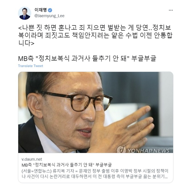 이 대표는 글에서 “나쁜 짓 하면 혼나고 죄 지으면 벌 받는 게 당연…”이라며 “정치 보복이라며 죄 짓고도 책임 안 지려는 얕은 수법 이젠 안 통한다”고 말했다.