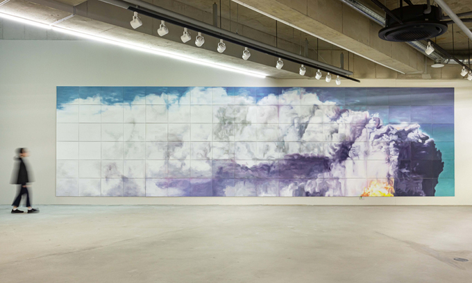 그리고 뭉게구름처럼 보이던 형상은 우측 하단에 작게 드러난 불꽃에서 피어오르는 연기다. 평화로워 보이던 장면은 불꽃을 발견하는 순간 재난 풍경으로 삽시간에 돌변한다. 실제로 이 작품은 국내에서 가뭄으로 인해 벌어진 대형 산불을 다룬 작업이다. 재난의 장면을 부분 포착으로 아름답게 느낀 경험은 관람자에게 이질적인 것들의 공존과 아이러니를 생각하게 한다. 동시에 60, 50㎝ 크기의 캔버스 120여개로 분할하고 재조합해 완성한 이미지는 회화성 그 자체를 체험할 수 있게 만든다. 대상이 가진 고유한 특성과 이야기를 제거해 색, 붓질의 흔적 등 순수한 회화적 요소에 집중시킨다.