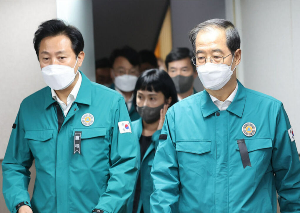 한덕수 국무총리(오른쪽)와 오세훈 서울시장이 지난달 30일 오후 서울시청에서 용산구 이태원 핼러윈 인파 압사 사고와 관련한 상황 점검을 위해 상황실로 들어서고 있다. 한 총리는 근조 글씨 없는 검은색 리본을 달았고 오 시장은 근조 글씨가 써 있는 검은색 리본을 달고 있다. 연합뉴스