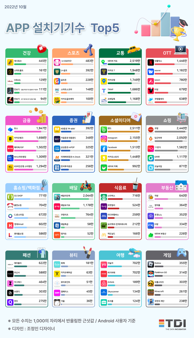 건강 관련 앱 가운데 10월 기준 설치 수 Top5는 ▲캐시워크 ▲스마트홈트 ▲InBody ▲만보기-걸음 측정기 및 칼로리 카운터 ▲만보기-걷기 앱 및 걷기 운동 어플 순으로 나타났다.
