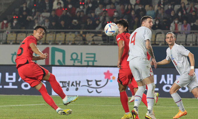 지난 11일 오후 경기도 화성종합경기타운 주경기장에서 열린 2022 카타르 월드컵을 앞둔 축구 대표팀의 마지막 평가전, 아이슬란드와의 경기. 한국 수비수 박지수가 경기중 부상을 입고 그라운드에 누워 있다. 연합뉴스