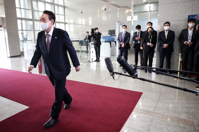 윤석열 대통령이 지난 10일 용산 대통령실 청사에서 가진 출근길 문답(도어스테핑)을 마친 후 집무실로 향하고 있다. 뉴스1