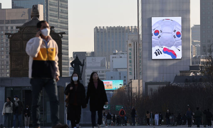 2022 카타르 월드컵 한국의 첫 경기를 하루 앞둔 23일 거리응원이 펼쳐질 서울 광화문광장의 모습. 한 빌딩 전광판에 한국팀 응원 문구가 표시되고 있다. 연합뉴스