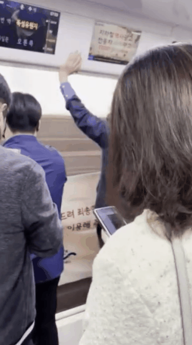 차량에 탑승한 역무원과 사회복무요원이 승객을 등진 채 출입문 앞에 서서 승객들이 출입문 근처로 오는 것을 막았지만 정작 직원들은 출입문을 절반가량 가린 안전막 외에는 딱히 의지할 게 없는 상태였다.