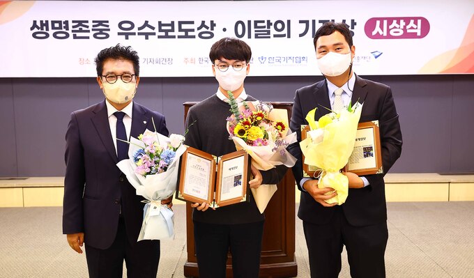 제386회(2022년 10월) 이달의 기자상을 수상한 세계일보 정치부 김병관(오른쪽), 조병욱 기자가 24일 서울 중구 한국프레스센터에서 열린 시상식에서 상패를 받은 뒤 포즈를 취하고 있다. 이들은 ‘돌아오지 못한 북(北) 억류자 6명’ 보도를 통해 2013년 이후 북한에 억류돼 있는 한국인 6명의 송환 문제에 대한 역대 정부의 조치를 평가하고 당국의 관심을 촉구했다. 김 기자는 수상 소감에서 “혈육의 생사도 모른 채 10년 가까운 시간을 견디고 있는 억류자 가족 분들에게 연대의 마음을 전하고 싶다”며 “억류자 문제가 해결될 때까지 계속 보도하며 힘을 보태겠다”고 말했다. 공동 수상자인 외교안보부 김선영 기자는 해외 출장 관계로 참석하지 못했다.