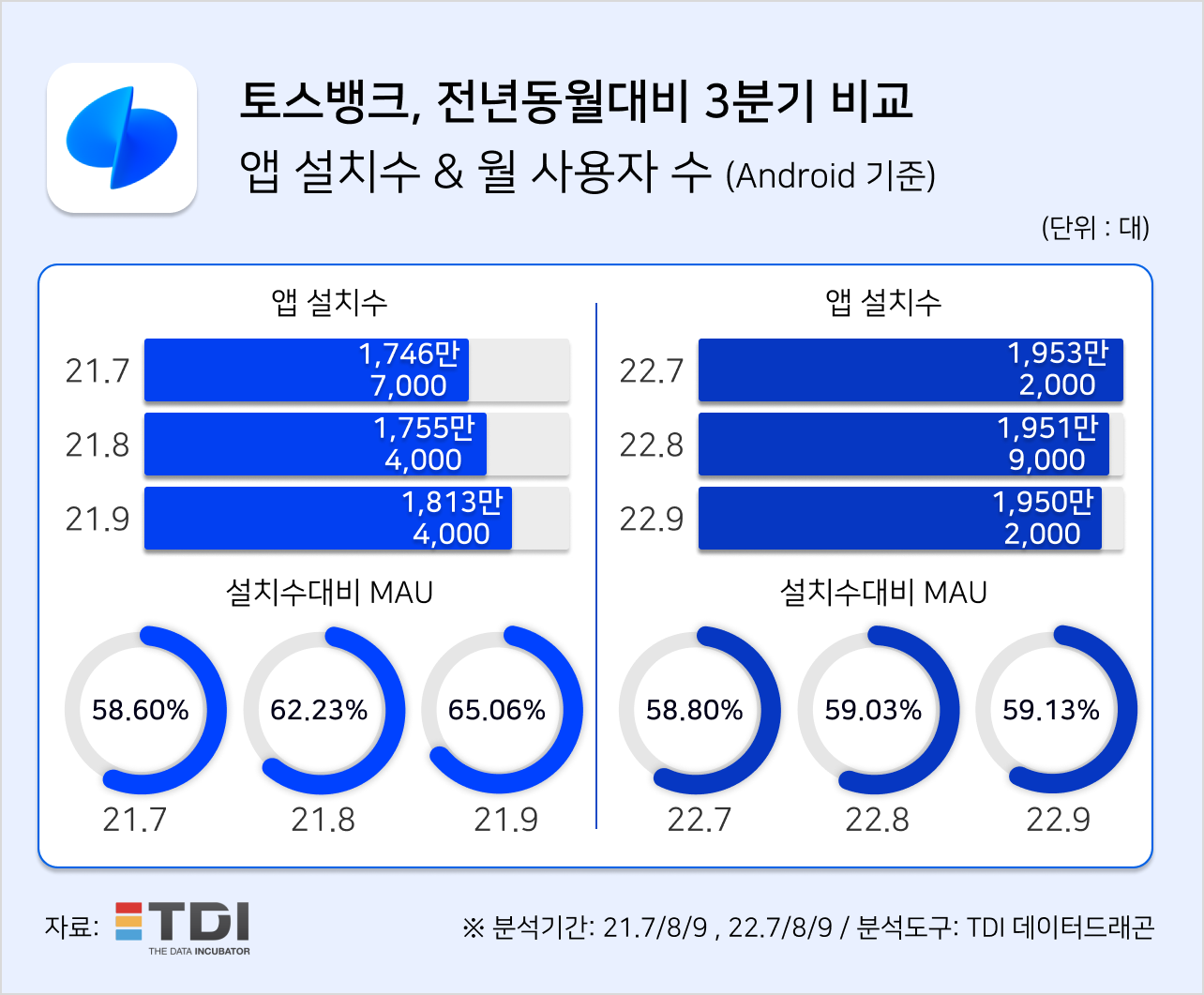 토스뱅크 3분기 말 고객 수는 476만명을 달성한 가운데 빅데이터 전문기업 TDI(티디아이, 대표 이승주)의 분석 플랫폼 데이터드래곤을 통해 전년동월대비 3분기 앱 설치 수 및 설치 수 대비 MAU(월 사용자 수)를 비교 분석했다.
