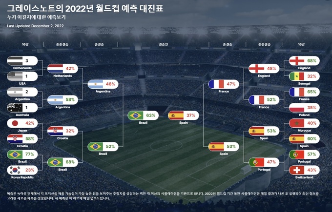 우리와 맞붙는 브라질의 8강 진출 확률이 77%로 가장 높고, 전통적인 축구 강호 국가인 잉글랜드와 프랑스가 각각 68%·65%로 나왔다. 스페인이 60%이고 포르투갈이 57%로 그 뒤다.