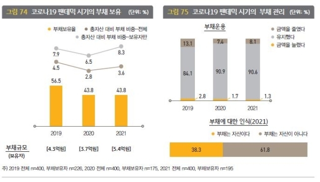 주택담보대출과 신용대출 등 금융 부채를 보유한 부자의 비중은 2019년 56.5%에서 2020년과 2021년에는 각각 43.8%로 낮아졌다.