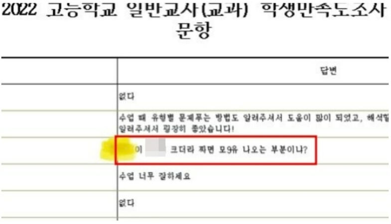 논란이 된 답변 중에는 ‘XX 크더라’, ‘김정은 기쁨조나 해라’ 등 교사 이름과 신체 부위를 언급하며 신체를 비하하고 성적 불쾌감을 유발하는 내용이 포함된 것으로 전해졌다.