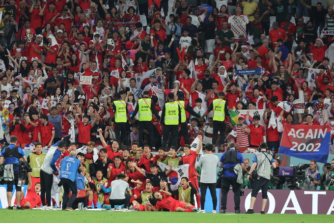 지난 2일 오후(현지시간) 카타르 알라이얀 에듀케이션 시티 스타디움에서 열린 2022 카타르 월드컵 조별리그 H조 3차전 대한민국과 포르투갈의 경기에서 2:1로 경기를 승리한 뒤 16강 진출이 확정된 선수들이 밝은 표정으로 응원단과 함께 기념 촬영을 하고 있다. 알라이얀=뉴스1