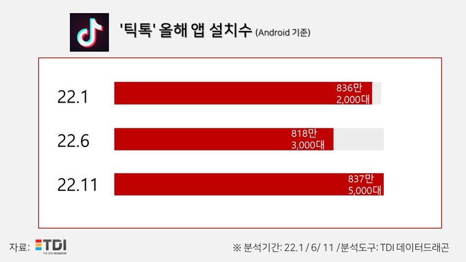 틱톡 올해 앱 설치수는 ▲1월 836만 9,000대 ▲6월 818만 3,000대 ▲11월 837만5000대로 1월 대비 6월 앱 설치수가 감소폭을 보였지만 다시 11월에는 증가했다.